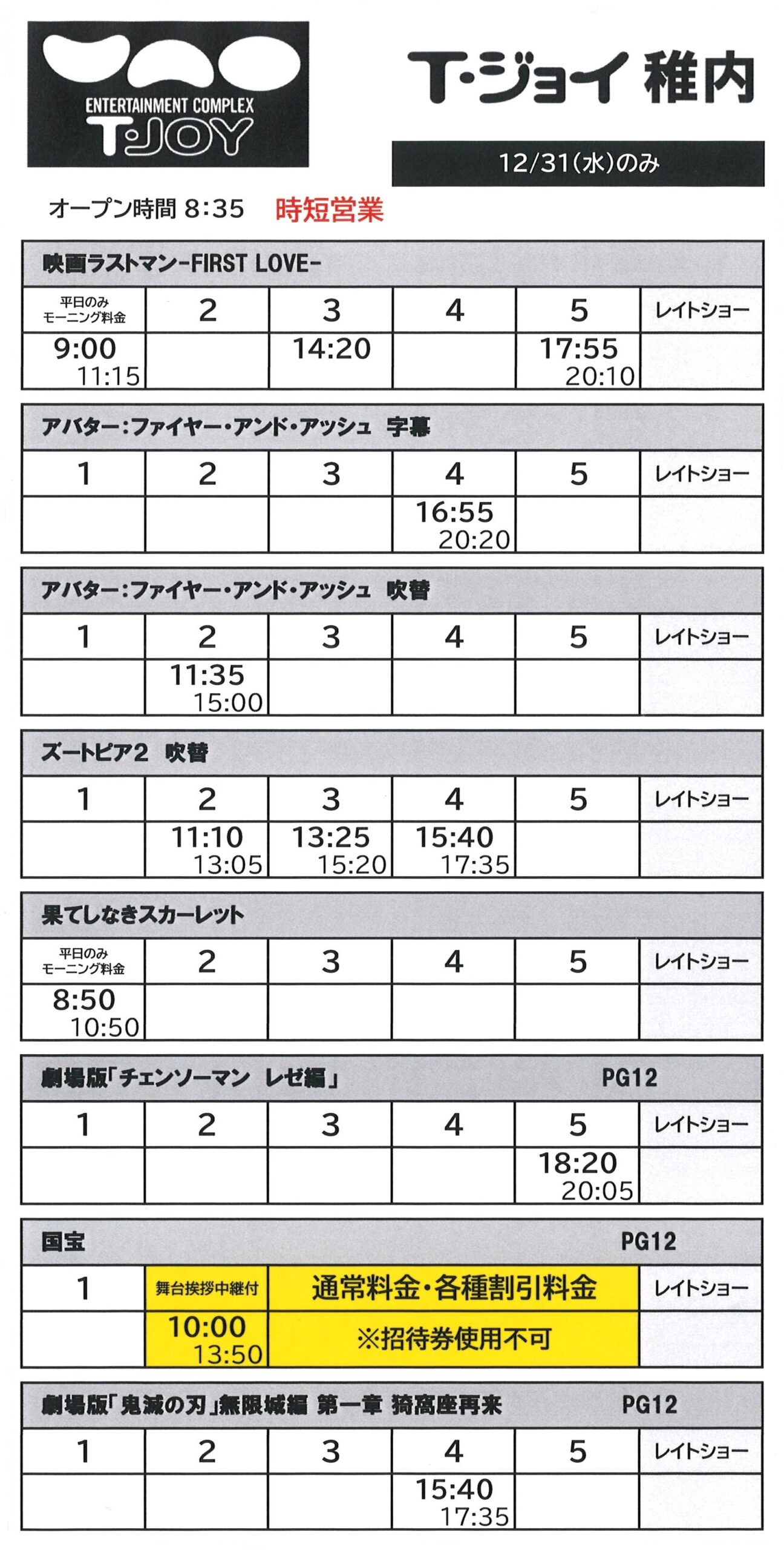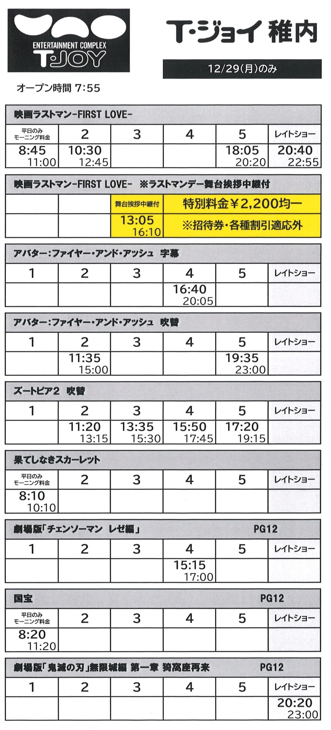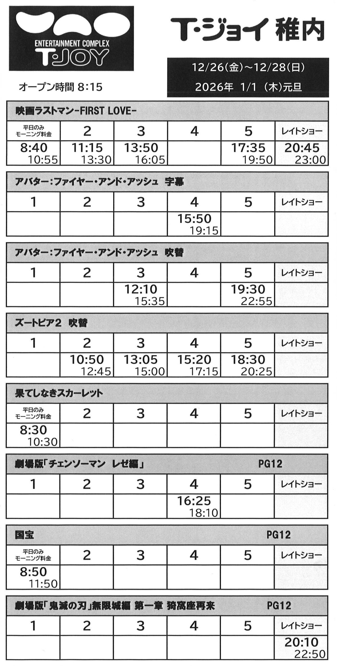 スマートフォンの方はスケジュール表を横にスクロールしてご覧ください。 10/29 金曜日の上映スケジュール 【D】 【D】 【D】 【D】 【D】 【D】 【D】 【D】 上映スケジュール 12月26日(金)~12月28日(日) / 2026年1月1日(木)元旦12月29日(月)のみ12月31日(水)のみ 料金につきましてはこちらをご確認ください。 ・学生割引・シニア割引き等の各種割引料金でのご鑑賞をご利用のお客様は、ご鑑賞当日、規定所定の証明書(学生証、身分証明書、障がい者手帳等)をお持ちください。 ・北海道の条例に従い、18歳未満の方や高校生の方は、上映終了時間が23時を過ぎる上映回には保護者同伴でもご入場いただけません。 ・当劇場は、全シアター各回入替制・全席指定席となっております。続けてのご鑑賞はできません。 ・当館内のコンセッション(売店)で販売している商品のみ、劇場内にお持込いただけます。他店からの飲食物のお持込はご遠慮ください。