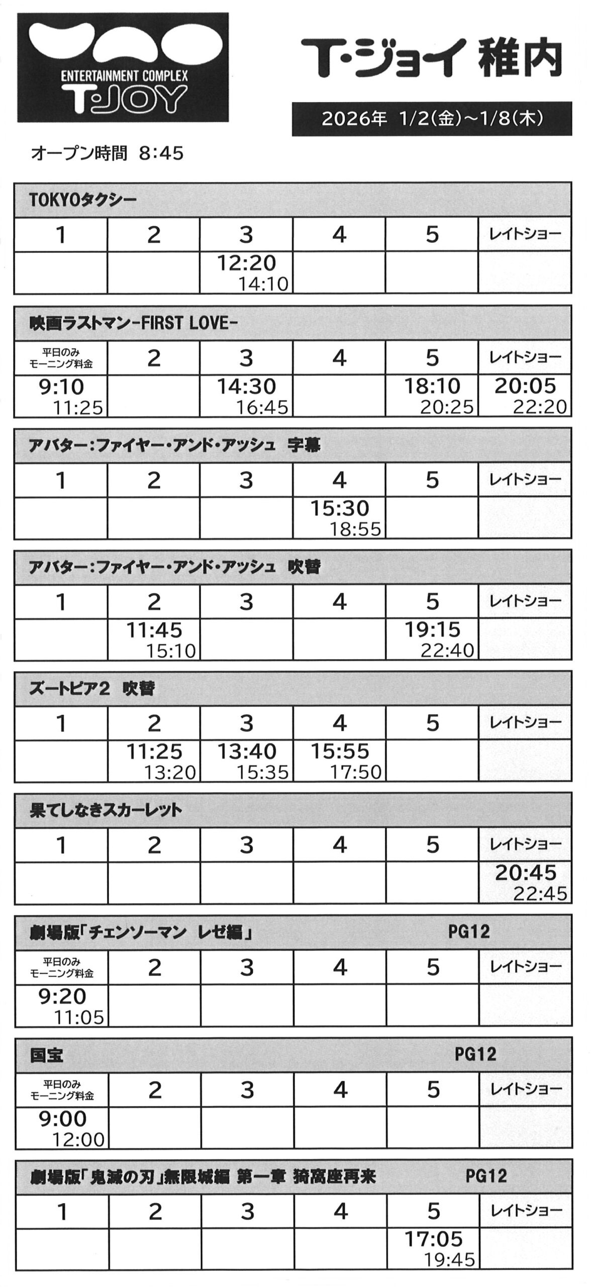 スマートフォンの方はスケジュール表を横にスクロールしてご覧ください。 10/31 日曜日の上映スケジュール 【D】 【D】 【D】 【D】 【D】 【D】 【D】 【D】 上映スケジュール 12月26日(金)~12月28日(日)・12月30日(火)/2026年1月1日(木)12月31日(水)のみ 料金につきましてはこちらをご確認ください。 ・学生割引・シニア割引き等の各種割引料金でのご鑑賞をご利用のお客様は、ご鑑賞当日、規定所定の証明書(学生証、身分証明書、障がい者手帳等)をお持ちください。 ・北海道の条例に従い、18歳未満の方や高校生の方は、上映終了時間が23時を過ぎる上映回には保護者同伴でもご入場いただけません。 ・当劇場は、全シアター各回入替制・全席指定席となっております。続けてのご鑑賞はできません。 ・当館内のコンセッション(売店)で販売している商品のみ、劇場内にお持込いただけます。他店からの飲食物のお持込はご遠慮ください。
