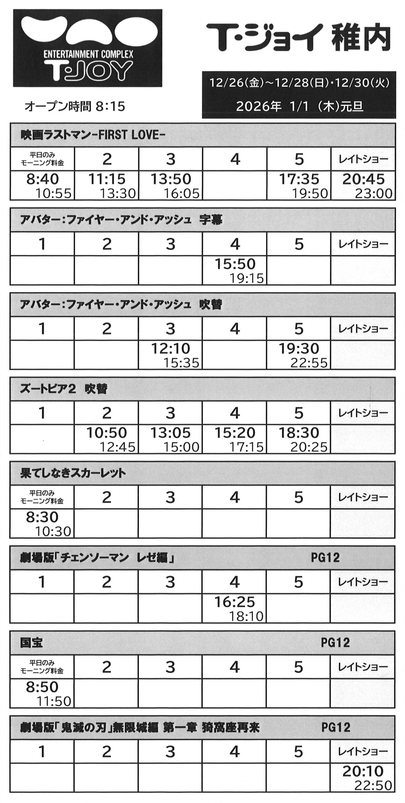 スマートフォンの方はスケジュール表を横にスクロールしてご覧ください。 11/4 木曜日の上映スケジュール 【D】 【D】 【D】 【D】 【D】 【D】 【D】 【D】 上映スケジュール 12月26日(金)~12月28日(日)・12月30日(火)/2026年1月1日(木)12月29日(月)のみ12月31日(水)のみ 料金につきましてはこちらをご確認ください。 ・学生割引・シニア割引き等の各種割引料金でのご鑑賞をご利用のお客様は、ご鑑賞当日、規定所定の証明書(学生証、身分証明書、障がい者手帳等)をお持ちください。 ・北海道の条例に従い、18歳未満の方や高校生の方は、上映終了時間が23時を過ぎる上映回には保護者同伴でもご入場いただけません。 ・当劇場は、全シアター各回入替制・全席指定席となっております。続けてのご鑑賞はできません。 ・当館内のコンセッション(売店)で販売している商品のみ、劇場内にお持込いただけます。他店からの飲食物のお持込はご遠慮ください。